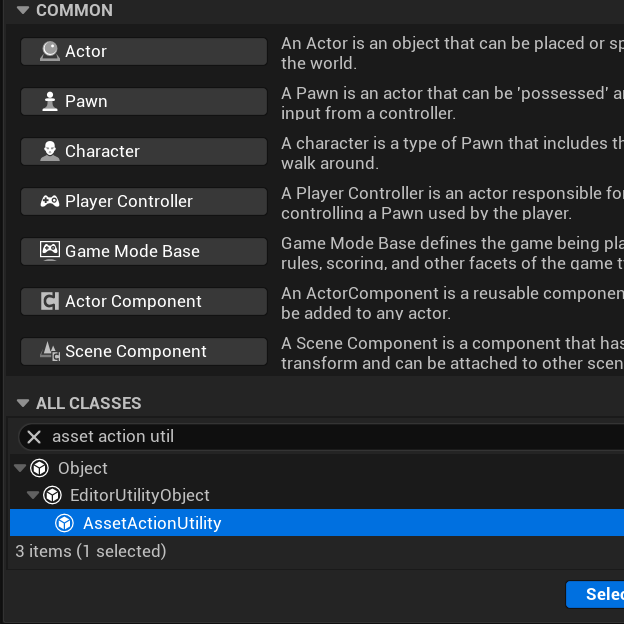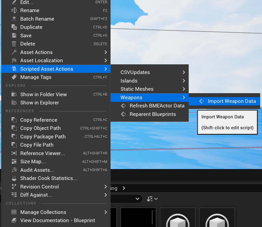 To call it, you could go to Tools > Execute Python Script…, but you can also create an AssetActionUtility blueprint. In there you can write a function that uses the Execute Python Command node (the function is automatically marked as Call In Editor). Give the function a category (e.g. “Weapons”). Then when you right click on any asset, and go to Scripted Asset Actions, you’ll find your AssetActionUtility function listed there.