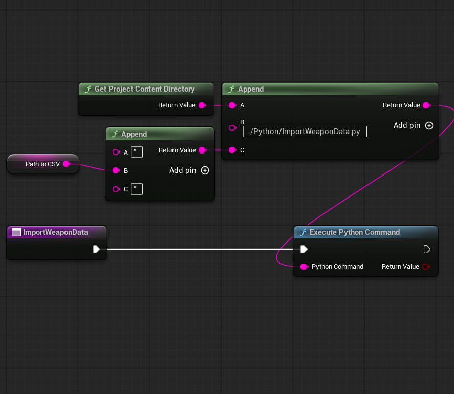In our city builder, we use spreadsheets as the source of this game data. Spreadsheets are great at visualizing data, they give you lots of options for complicated calculations, and they’re a familiar front-end to any type of designer. If you want to import a spreadsheet into Unreal, you could simply export the CSV and import it as a datatable, but that would break the asset-centric project organization. That datatable would have references to all weapon types. Instead, we use Python scripts to read out the CSV files and edit the assets directly, and they’re actually quite simple to make.