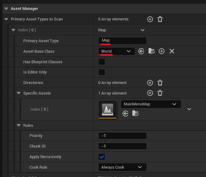 As you work on your game, Unreal builds a tree of asset dependencies. For each asset, it tracks which other assets are needed in order for it to work. For instance, your map needs a game mode class, the game mode needs a character class, and the character needs a skeletal mesh, textures, and animations. Unreal can automatically gather all this information for us, as long as we tell it the root(s) of the tree. These roots are known as the Primary Assets. The engine comes with a few predefined primary asset classes, most notable of which is the Map.