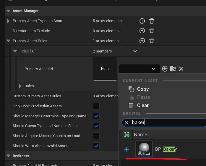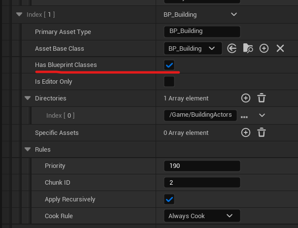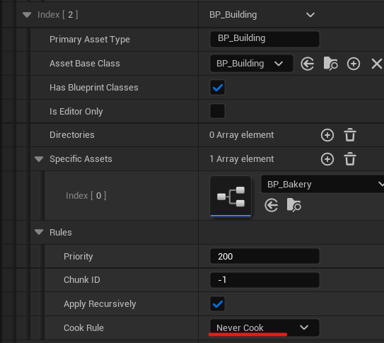 +PrimaryAssetTypesToScan=(PrimaryAssetType="BP_Building",AssetBaseClass="/Game/BP_Building.BP_Building_C",bHasBlueprintClasses=True,bIsEditorOnly=False,Directories=,SpecificAssets=("/Game/BuildingActors/BP_Bakery.BP_Bakery"),Rules=(Priority=200,ChunkId=-1,bApplyRecursively=True,CookRule=NeverCook))