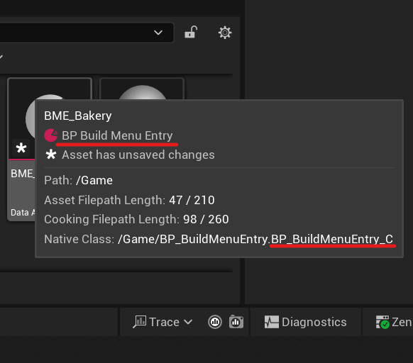 You can create a new blueprint that inherits from PrimaryDataAsset. In this blueprint you can add the fields (variables) each asset has to specify. After that, you can make an instance of that blueprint from the context menu, by going to Miscellaneous > Data Asset, and selecting the type you just created. You can once again use the hover trick on the data asset instance to see its Primary Asset type. In fact, if you create a PrimaryDataAsset class in blueprints, the engine will throw a “_C” at the end of the asset type to confuse you. Making a PrimaryDataAsset this way does not require the Has Blueprint Classes, or the Should Manager Determine Type and Name.