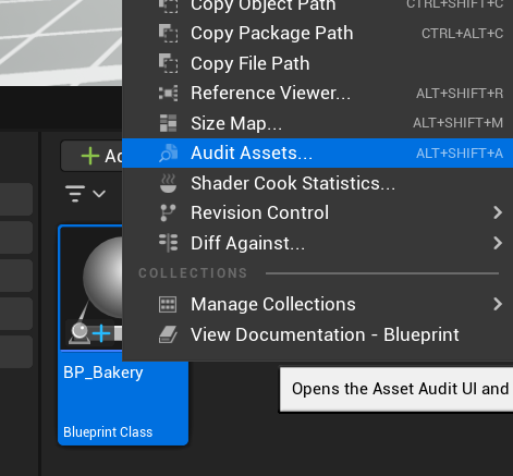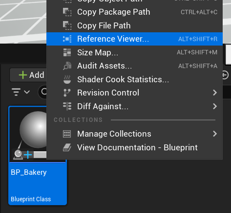 This basically means that there are still assets in the cook with a hard reference to the assets you excluded. So how do we fix that? Find the target package in the asset browser (in this case, it is BP_Bakery) and open it with the Reference Viewer.