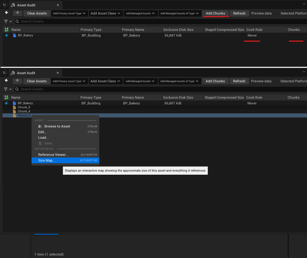 If you want to check which chunk a specific asset is being claimed by, you can open it with the Asset Audit tool. Here you can see the chunk(s) that depend on this asset, and the cook rule that ended up being applied. You can also use this window to inspect the chunks themselves by clicking Add Chunks. This way you’ll see which chunks exist, but you can also use this to open an entire chunk with the Size Map tool.